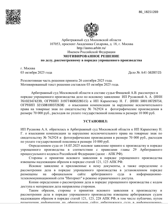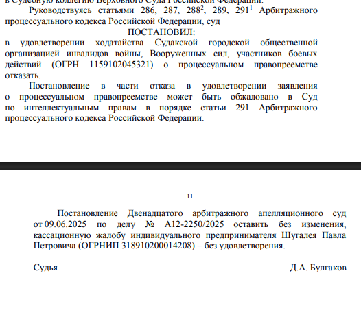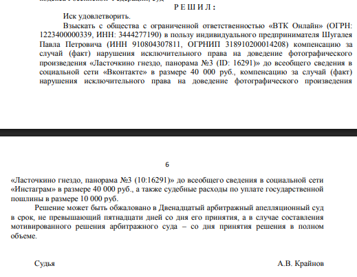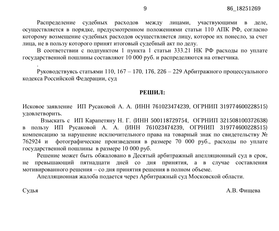Дело началось с полного удовлетворения требований истца в первой инстанции. Я подготовил апелляцию без дополнительной оплаты и добился снижения суммы компенсации. Затем истец попытался оспорить результат в Суде по интеллектуальным правам, но проиграл. В завершение процесса в пользу ответчика были взысканы судебные расходы.